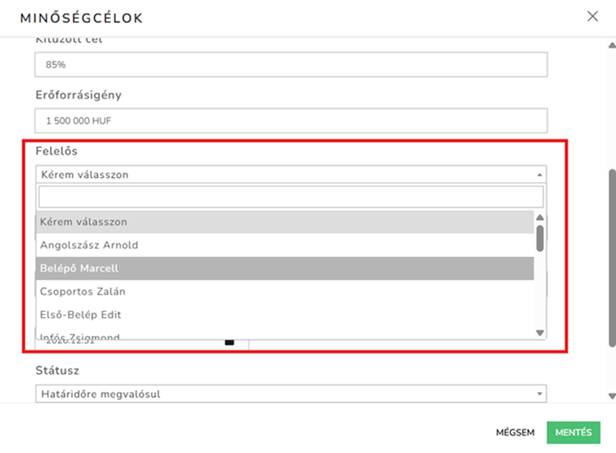 A Minőségcélok felület új funkcióval bővült, amely lehetővé teszi a felelősök kiválasztását a felhasználói listából.