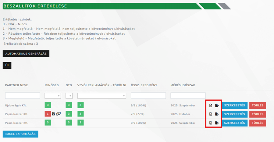 Új funkció - Beszállítók értékelése (gyűjtő) – Dokumentum generálás