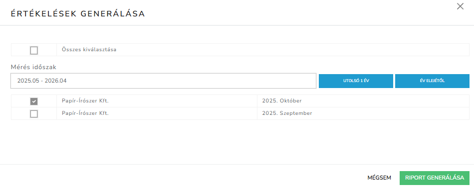 A választható időszakok köre attól függ, hogy melyik értékelt időszakból indítjuk a műveletet, és az indítás alapjául szolgáló időszak minden esetben automatikusan kiválasztásra kerül a generálás során.